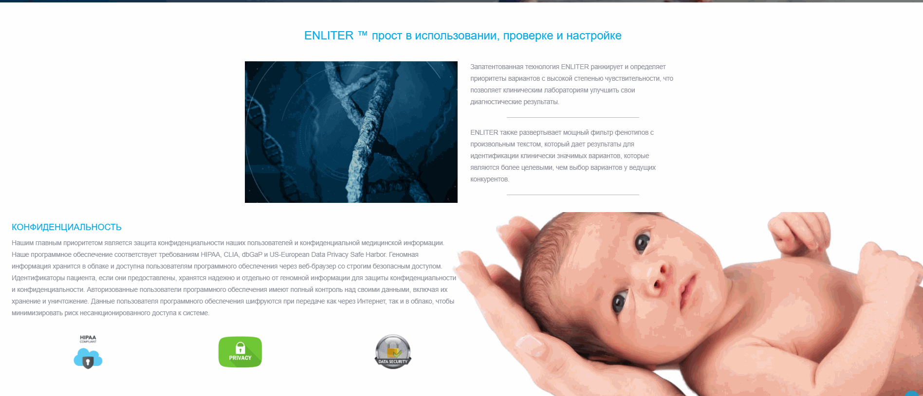 Геномная информация хранится только на собственных серверах, никогда не выгружается в облако и доступна пользователям через веб-браузер со строгим безопасным доступом. Идентификаторы пациента, если они предоставлены, хранятся надежно и отдельно от геномной информации для защиты конфиденциальности.