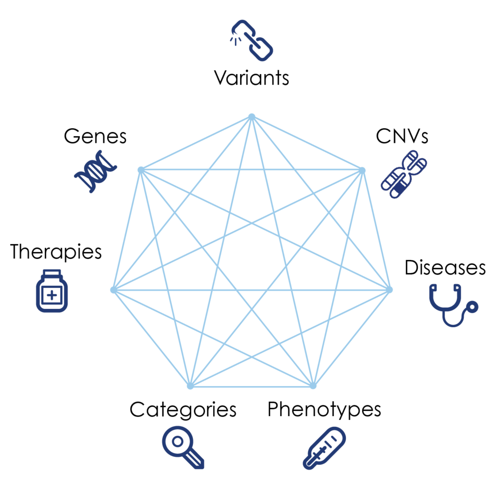 доказательств, рисунок информативных связей между генами, варианты, количество копий вариантов (ВКК), заболевания, фенотипы, терапии и