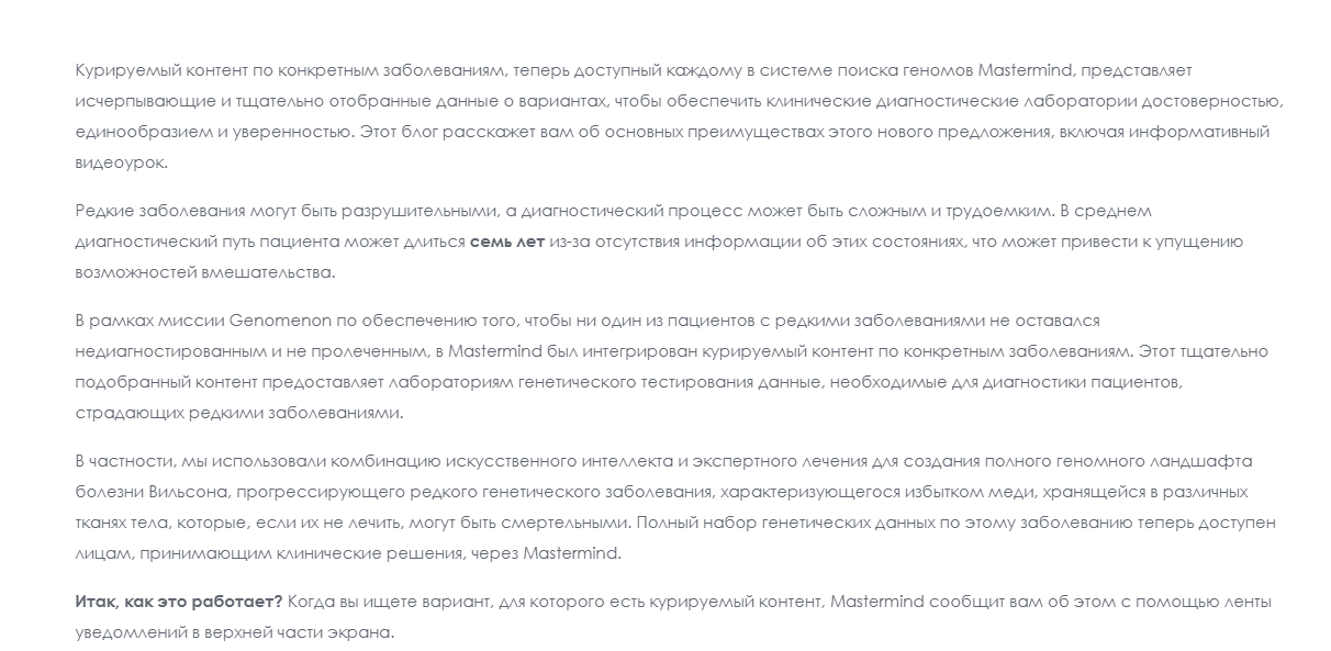 В рамках миссии Сепотепоп по обеспечению того, чтобы ни один из пациентов с редкими заболеваниями не оставался недиагностированным и не пролеченным, в Маз1ептита был интегрирован курируемый контент по конкретным заболеваниям. Этот тщательно подобранный контент предоставляет лабораториям генетического тестирования данные, необходимые для диагностики пациентов, страдающих редкими заболеваниями.